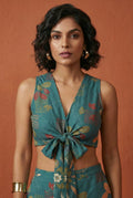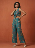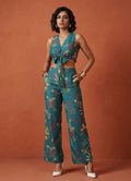 The matching full-length pants come in a forest print on teal blue fabric, offering both comfort and style with a half belt, half elastic waistband. A perfect fusion of modern prints and easygoing elegance.