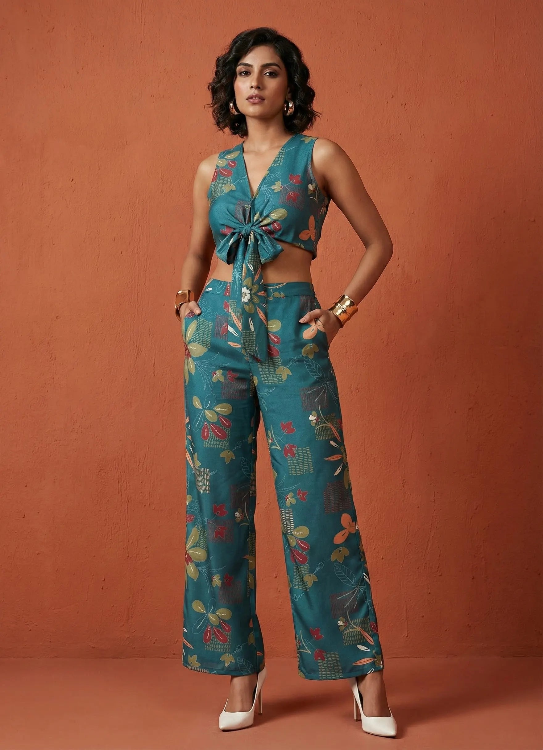 Refresh your wardrobe with this elegant teal blue co-ord set, ideal for both regular and occasional outings. The sleeveless top features a flattering V-neck and a unique geometric floral print, designed in soft cotton blend digital fabric with a waist-length silhouette that’s easy to style and maintain with a gentle machine wash.