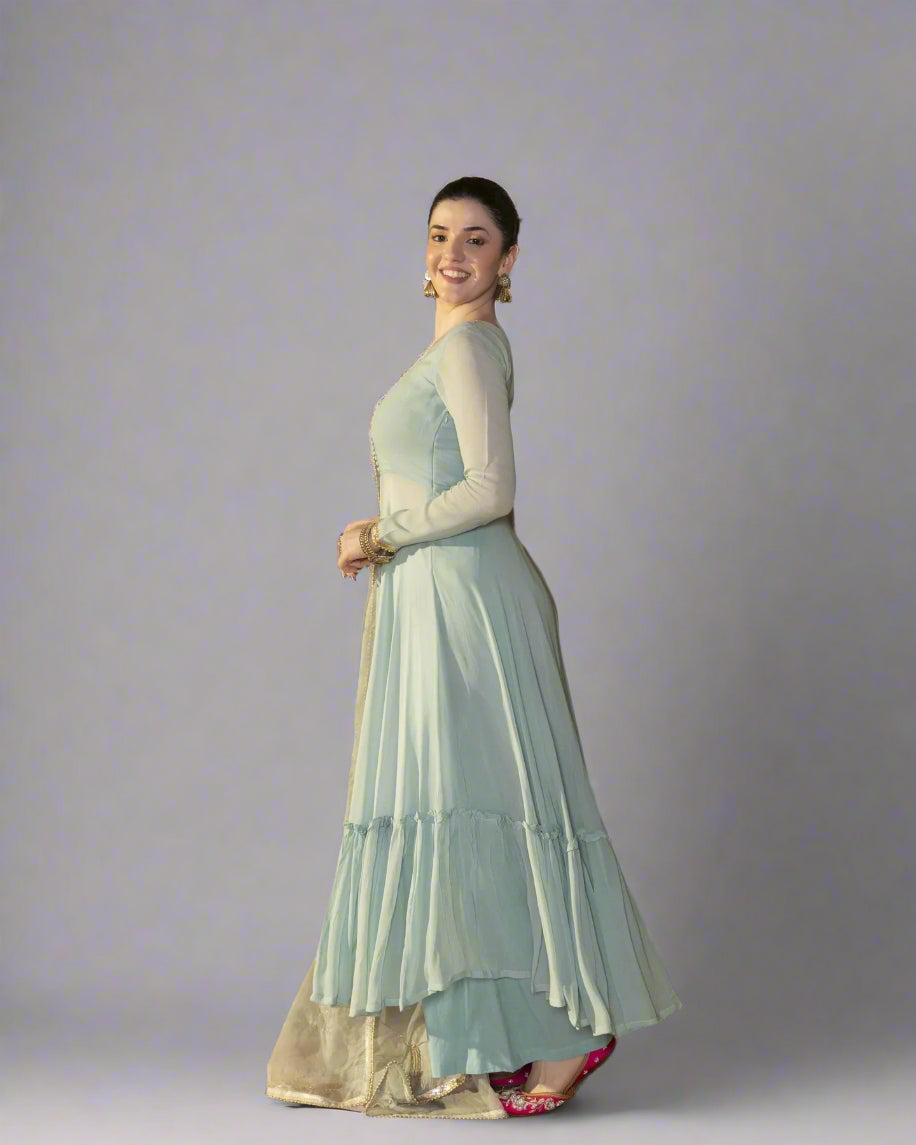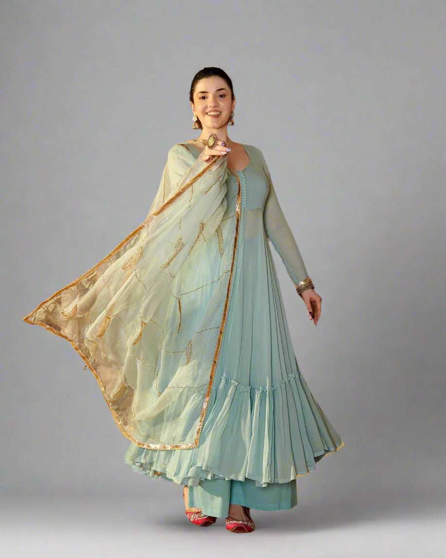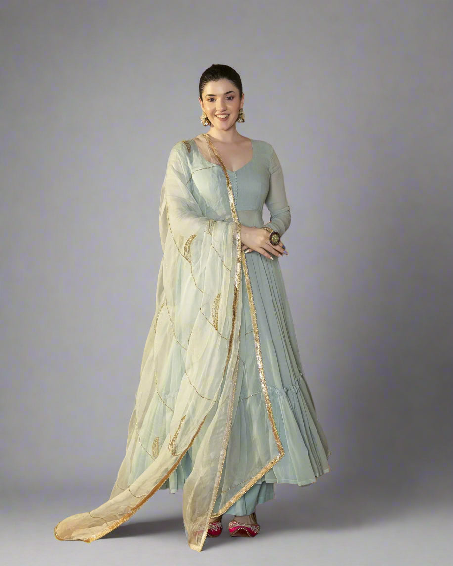 Elevate your style with this graceful sky blue georgette anarkali set, featuring full sleeves and a charming sweetheart neckline. The below-knee anarkali pairs beautifully with matching full-length palazzo pants, designed with a comfortable half-belt, half-elastic closure. A statement gota patti embroidered dupatta completes the look, making it a perfect choice for both occasional wear and regular elegance.