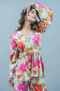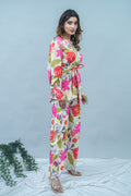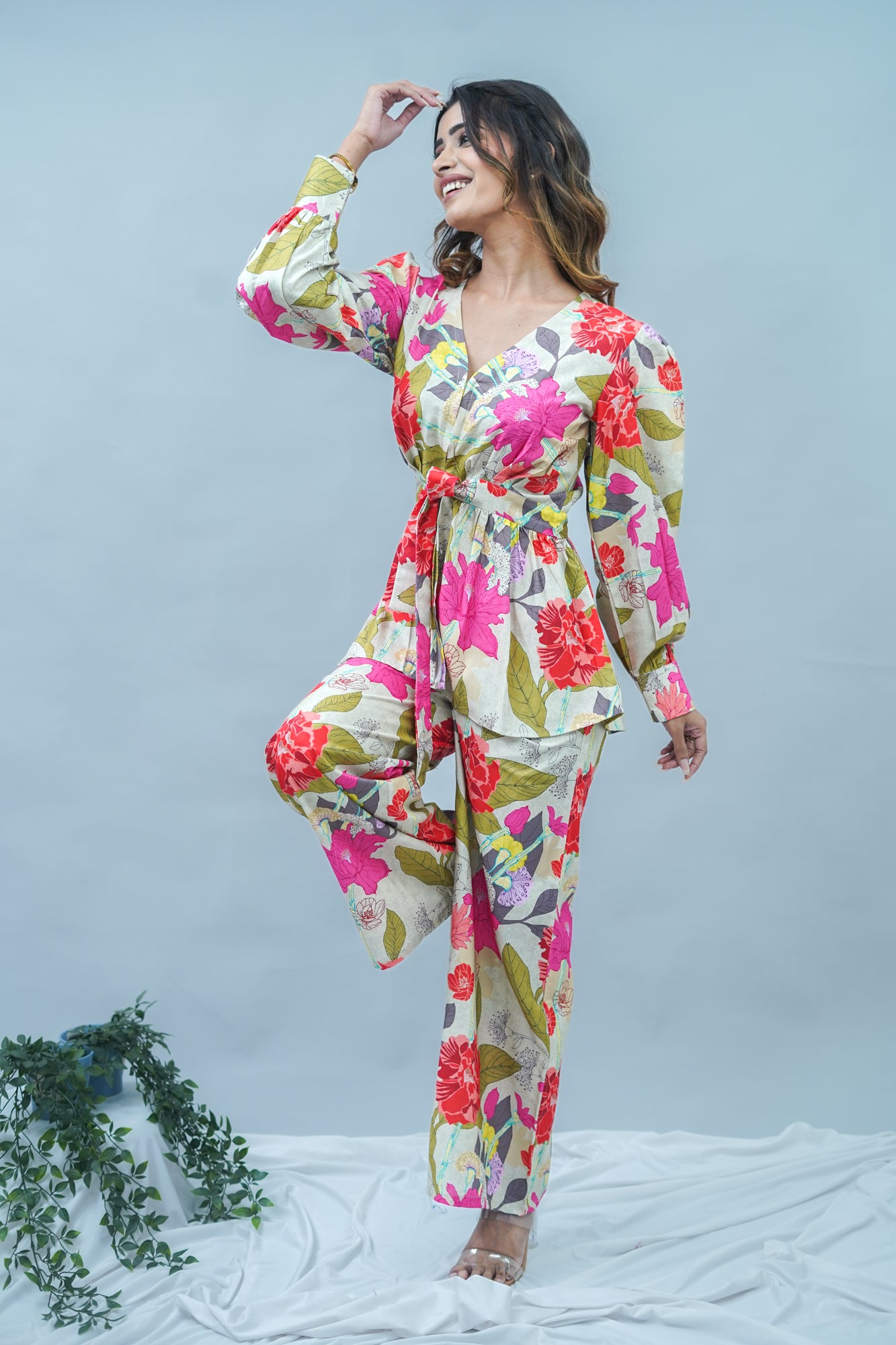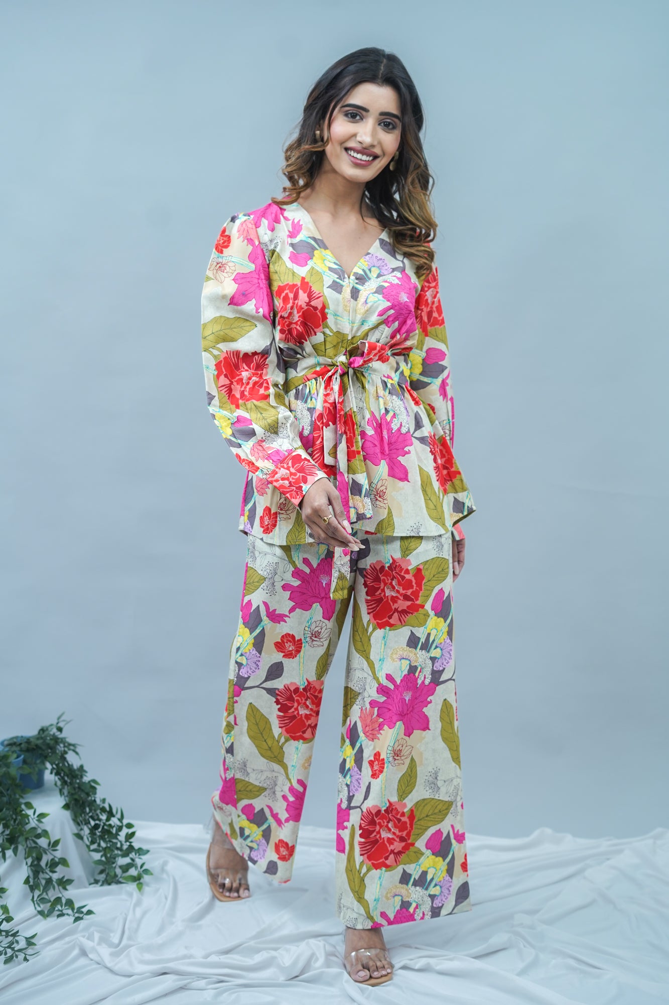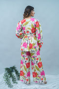 The matching bottom, also in Wellbeing Green with the same floral print, boasts a full-length design. It is designed with a half-belt and half-elastic closure, offering both comfort and a perfect fit. Ideal for a variety of occasions, this set combines style, comfort, and practicality seamlessly.