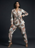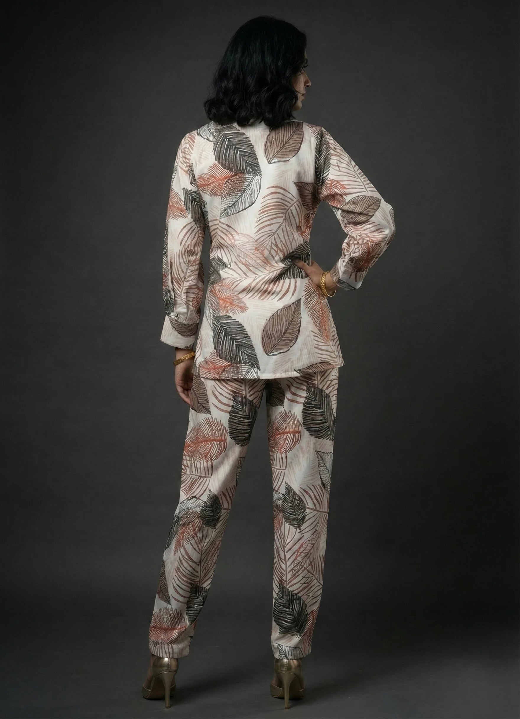 This chic Jacket Collar Overlap top and bottom set in White features a bold leaf print.
