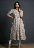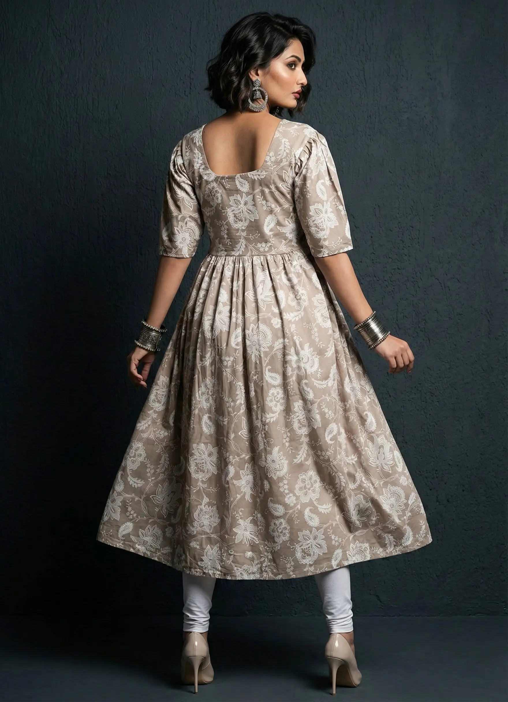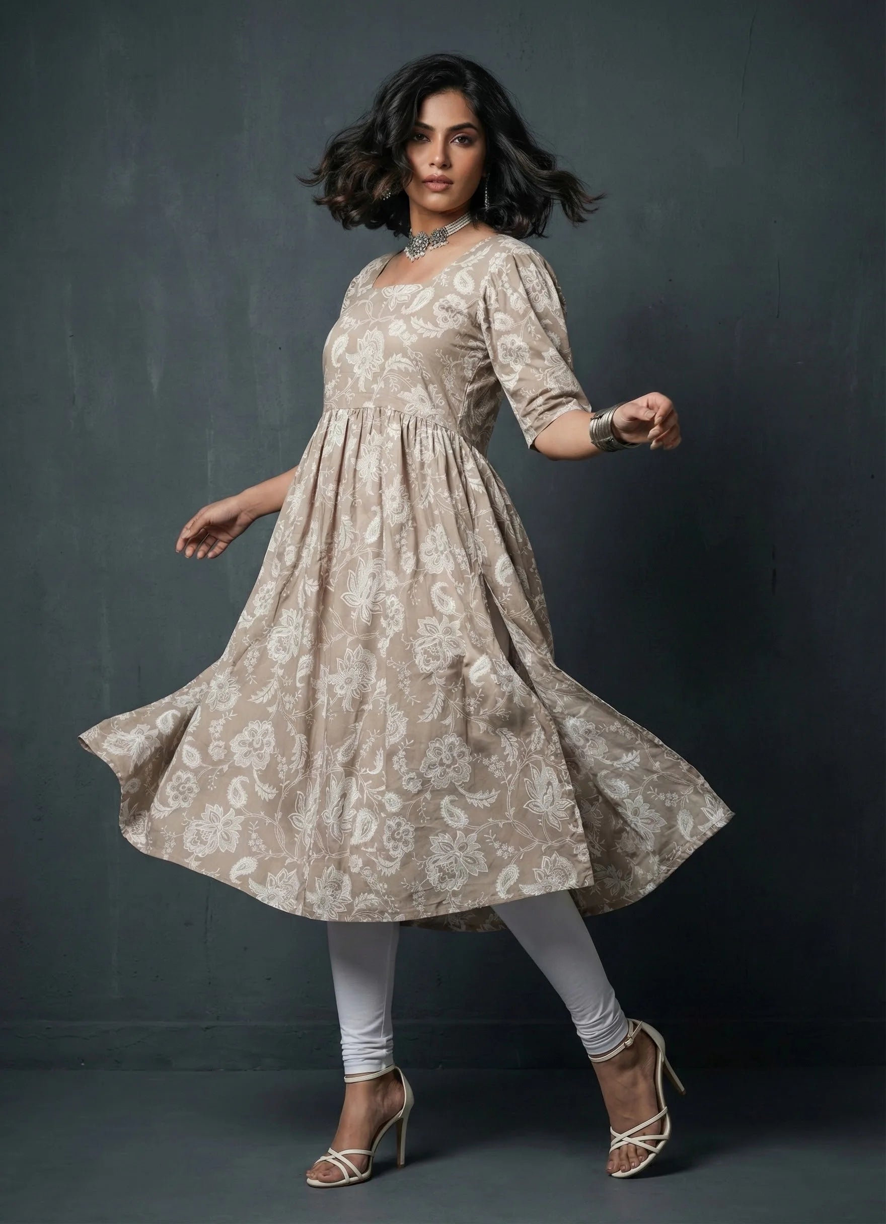 This garment is characterized by its simplicity and elegance. Designed out of white floral printed Cotton Blend fabric. This pattern consists of a square neck, half length leg of mutton sleeves, gathers and two side slits . This is a unique and eye-catching silhouette while maintaining a comfortable fit.
