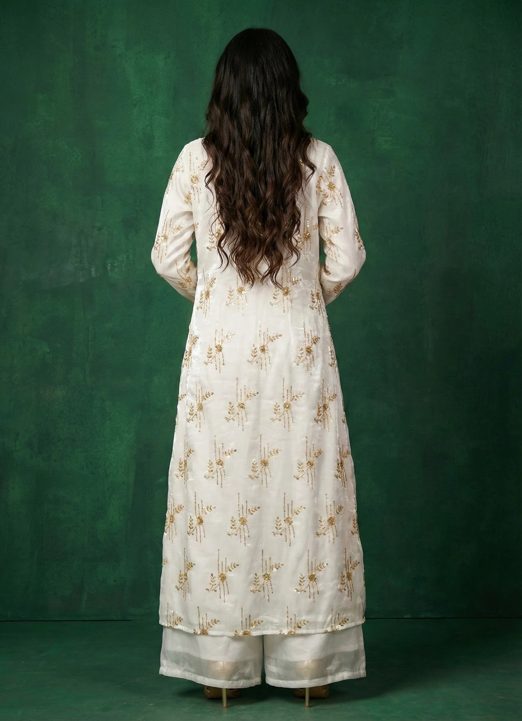 Paired with plain white flare palazzo pants for a flowing silhouette. Crafted in embroidered organza and soft organza fabric for lightweight comfort. Perfect for occasional gatherings and festive celebrations with timeless charm.