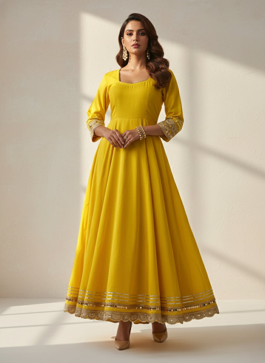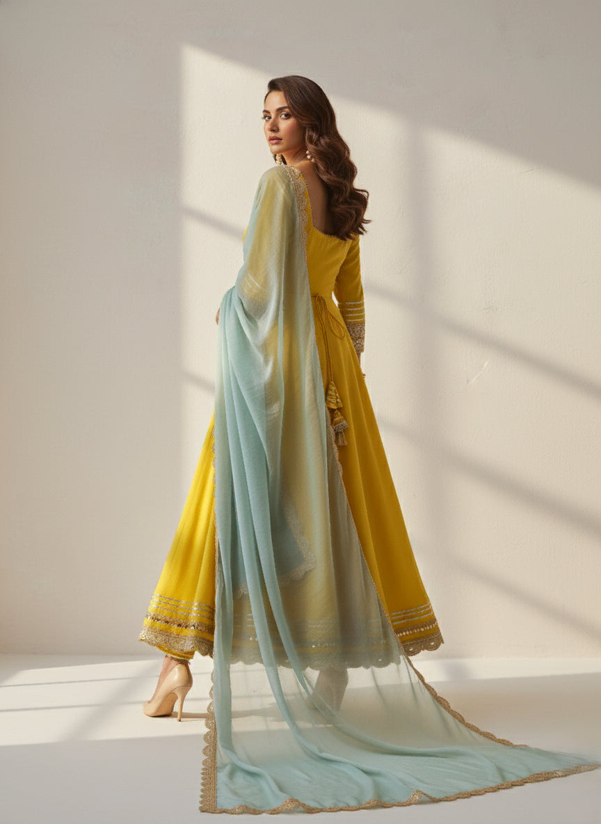 A sunny yellow Anarkali set featuring a sweetheart neckline and full sleeves. Lace detailing on the back and sleeves adds subtle elegance. Crafted in luxurious Roman silk for the Anarkali and pants for a rich finish. Paired with plain narrow pants for a streamlined, graceful look. Completed with a sky blue organza scallop lace dupatta for a contrasting charm.