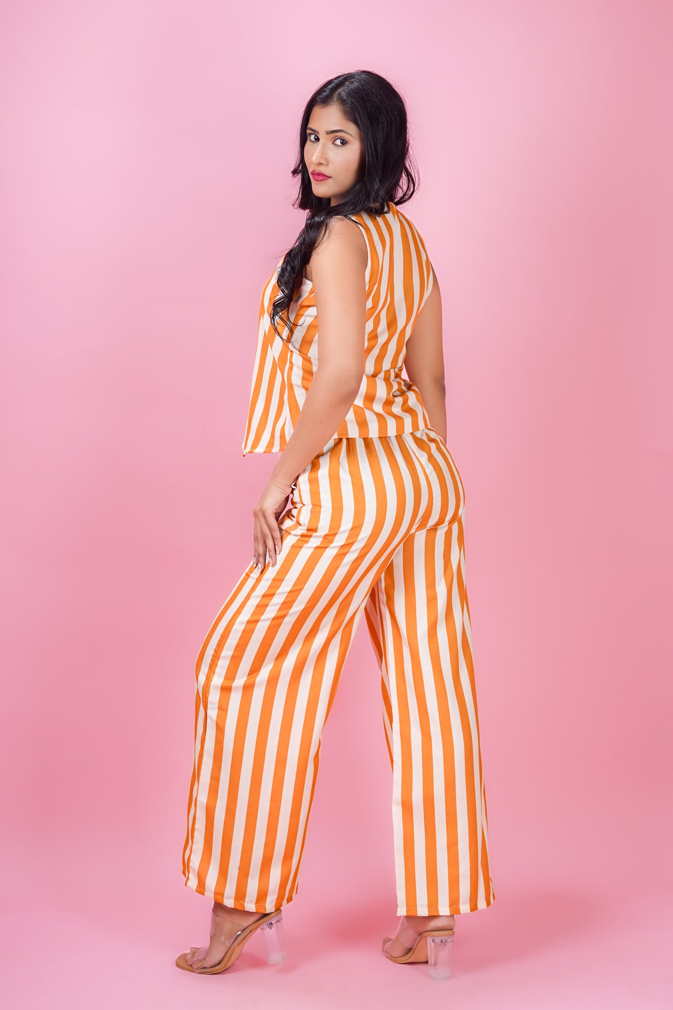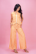 This chic set features a harmonious yellow-beige mix with classic stripe prints. The sleeveless coat shirt top has a flattering V-neck and a waist-length silhouette, crafted from soft Cotton blend for a gentle machine wash and comfortable fit. It pairs beautifully with matching full-length palazzo pants featuring the same stripe print and a convenient half belt half elastic closure. Ideal for both occasional and regular wear, this ensemble blends effortless style with everyday comfort.