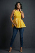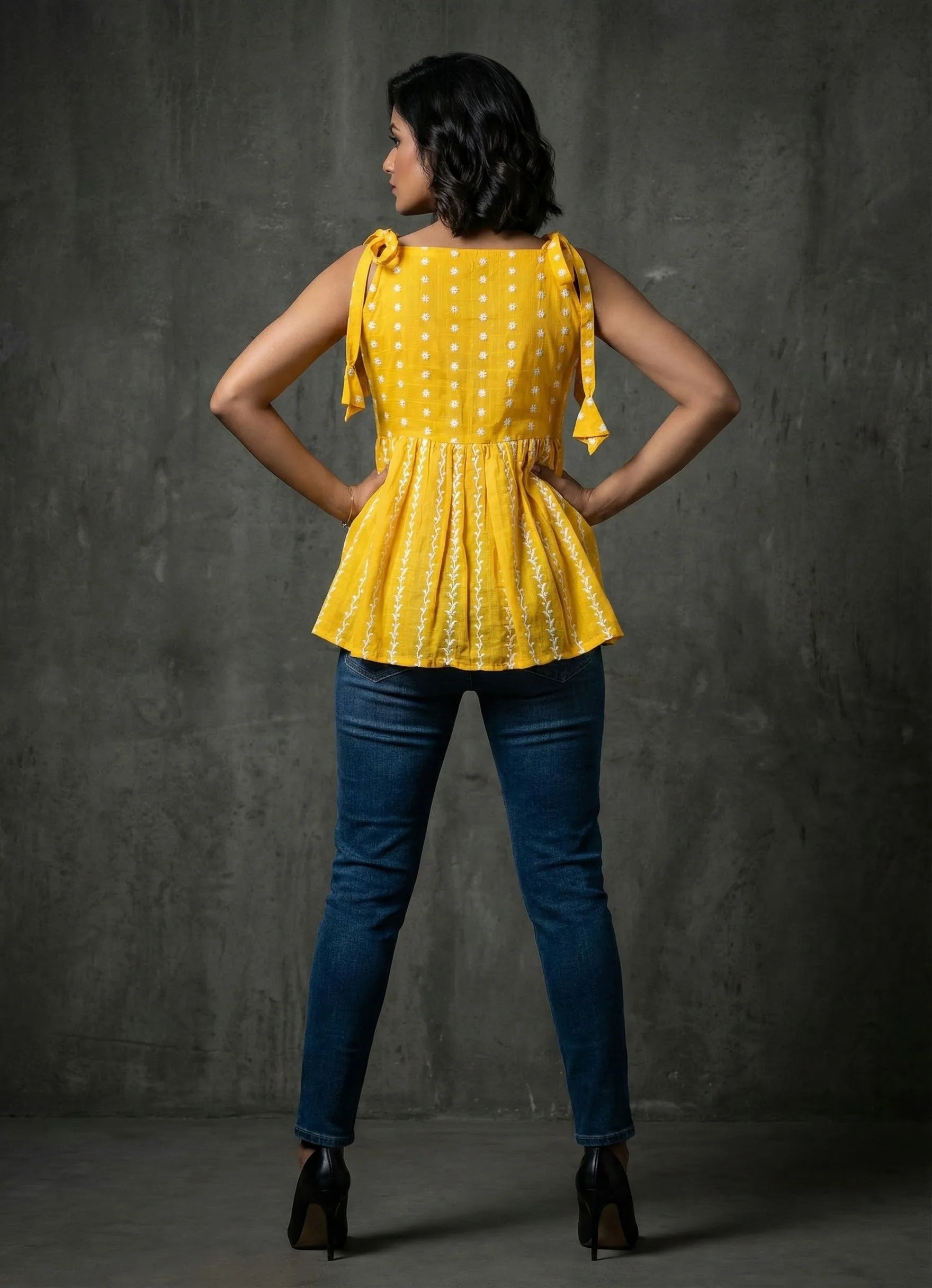 This peplum style top crafted out from yellow chikankari fabric is perfect for the bright start of some special occasion or a casual outing. It has a modern style cut with straped square neckline and gathers around the whole waist.