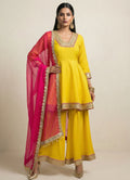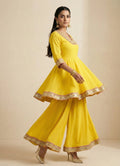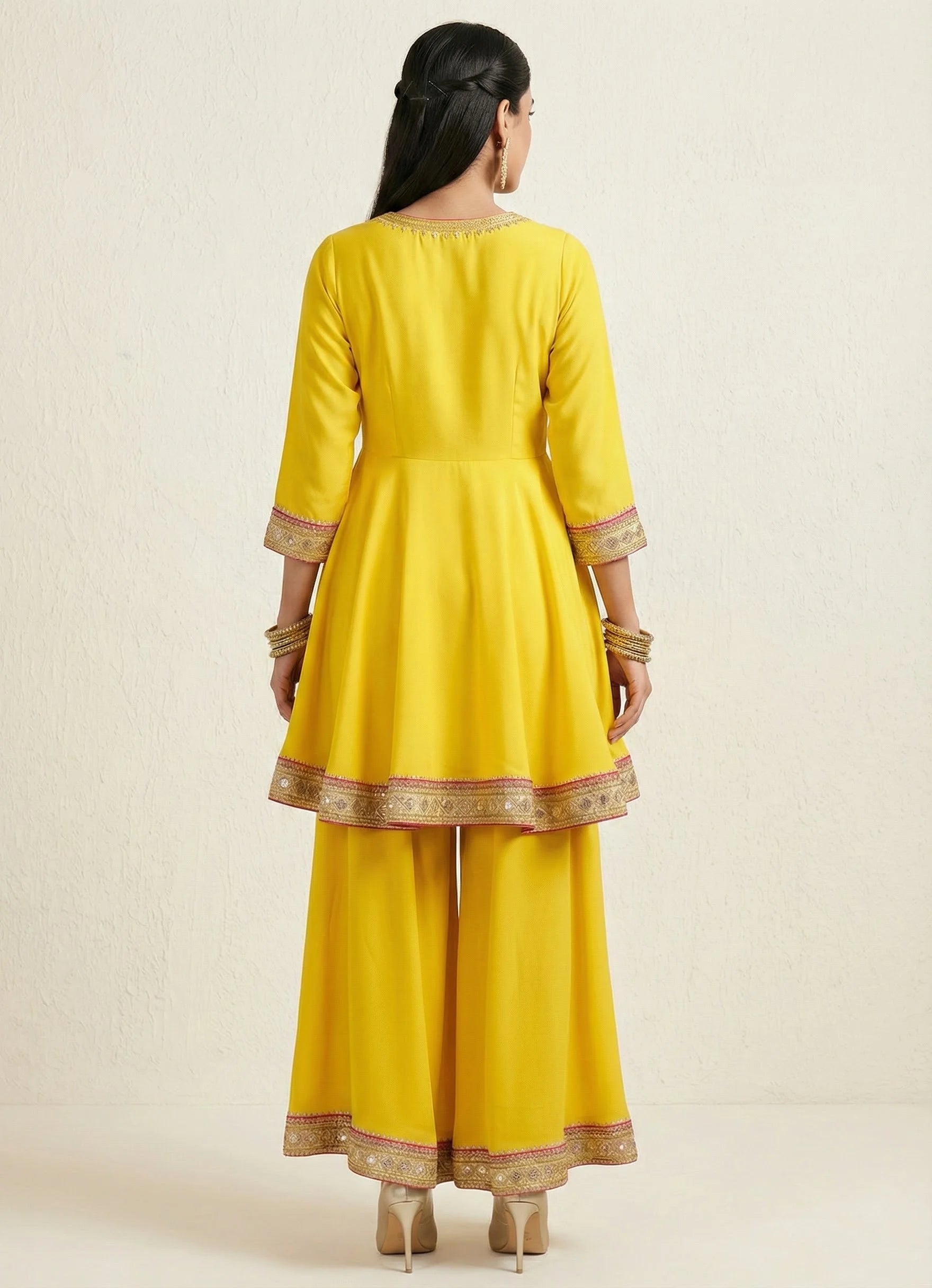 A bright yellow peplum top featuring ¾ sleeves and a square neckline. Adorned with delicate floral strip embroidery for a festive charm. Crafted in luxurious Roman silk for comfort and elegant drape.
