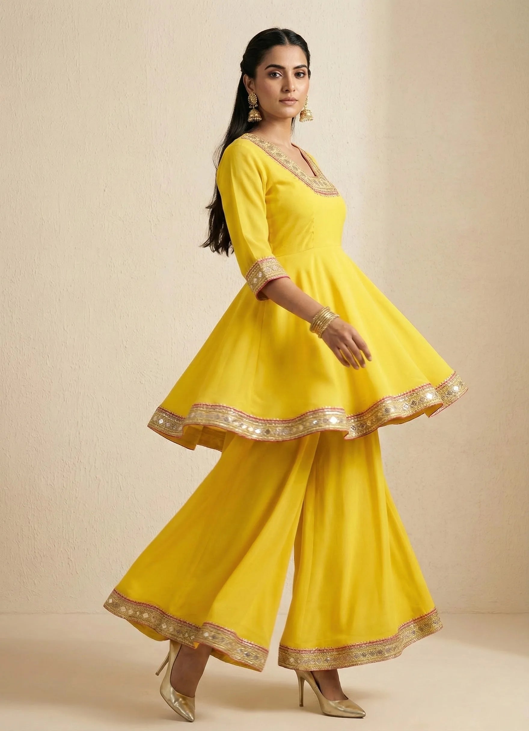Styling: peplum top, flare pant with organza dupatta