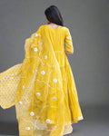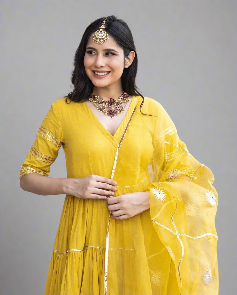 A golden yellow V-overlap elbow-sleeve anarkali with palazzo pants, paired with an elegant gotapatti organza embroidered dupatta. Perfect for both festive occasions and graceful everyday wear, blending comfort with timeless elegance.