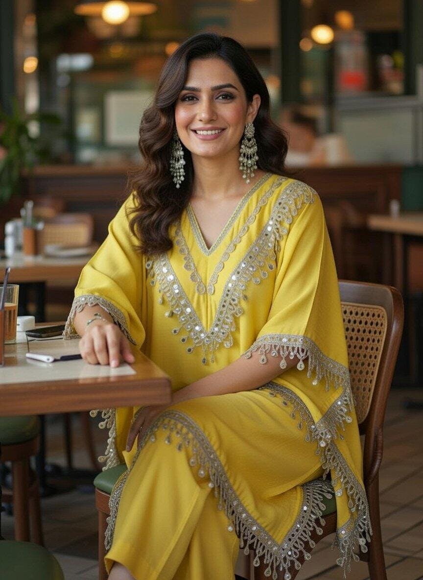 A vibrant yellow kaftan-style set designed for festive elegance. The 3/4 sleeve kaftan top is adorned with delicate mirror lace detailing. It comes with a matching yellow inner of below-knee length for added grace.